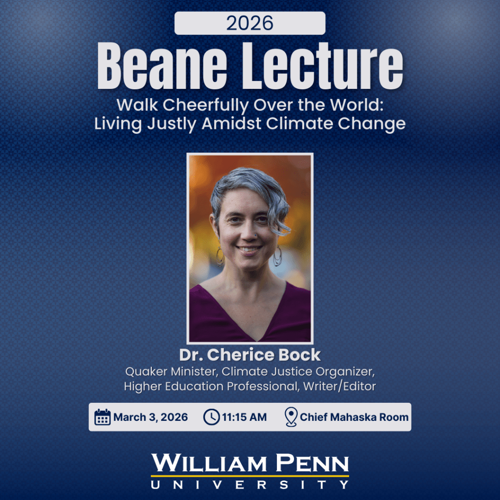 Last week, I had the opportunity to offer the Beane Lecture at William Penn University in Oskaloosa, Iowa. My topic was, “‘Walk Cheerfully Over the World’: Living Justly Amidst Climate Change” (the link is to a video of the talk, if you’re interested). The Beane Lecture offers an opportunity for students, faculty, and the community to hear from a Quaker scholar, hopefully connecting something about Quaker values with current issues and at least one academic discipline.