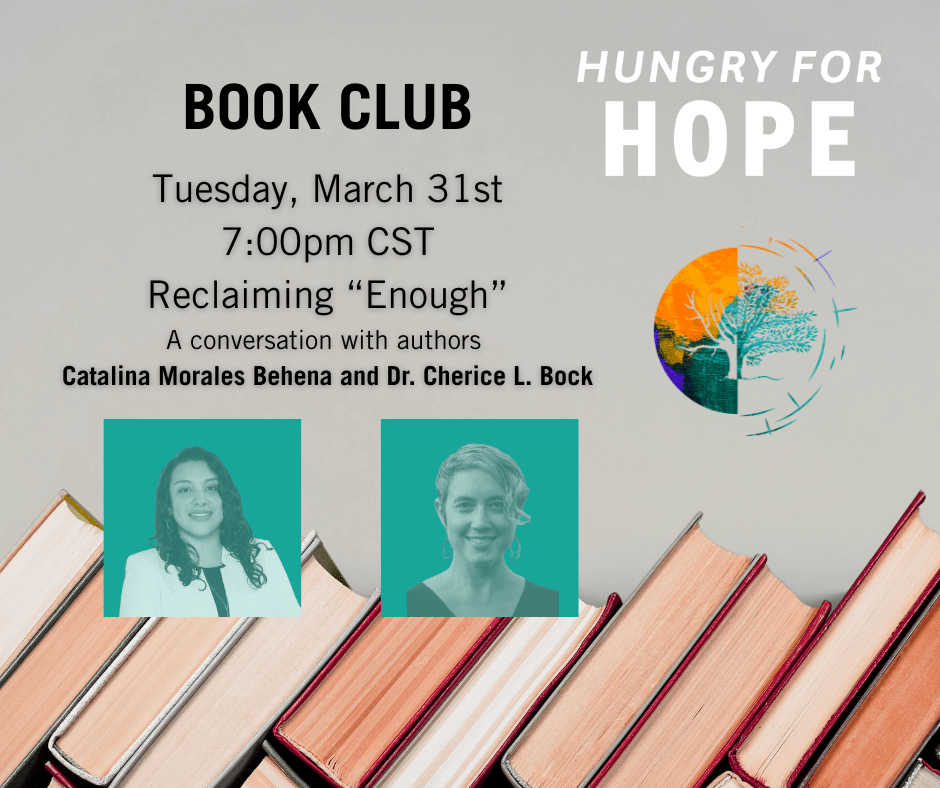 Our March book club chapter conversation is timely in both our country and this time of year during Lent. What does enough look like right now? What does that abundant life look like right now for us and our neighbors? Join us this month for our next book club conversation focused on the Hungry for Hope chapter “Reclaiming ‘Enough'” written by Catalina Morales Bahena and Dr. Cherice Bock.